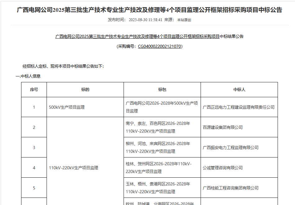 - · 广西电网公司2025第三批生产技术专业生产技改及修理等4个项目监理公开框架招标采购项目投标圆满成功[ 2025-10-14 ]