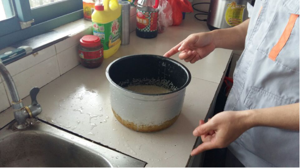 3、加水。这步较为关键,在加水前先把米摊平,水的多少直接影响到米饭的质量,水位以高出米7mm~11mm为佳。随大米的增加,水位宜适当在7mm~11mm范围增加。