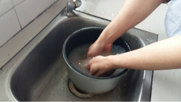 2、洗米。宜轻柔掏洗两次为佳,把米糠、杂物去除。一定不要超过3次,如果超过3次,米里的营养会大量流失,影响饭的香味与营养