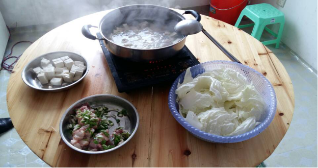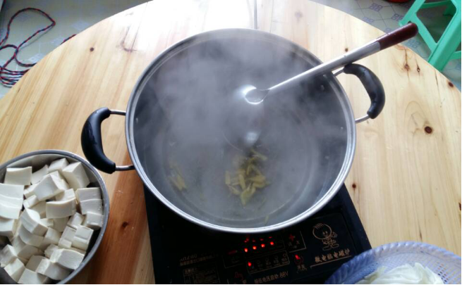 8、材料:水豆腐2元,五花肉一斤13元,大白菜两斤3元,松花1元。简单而有营养的5人餐。