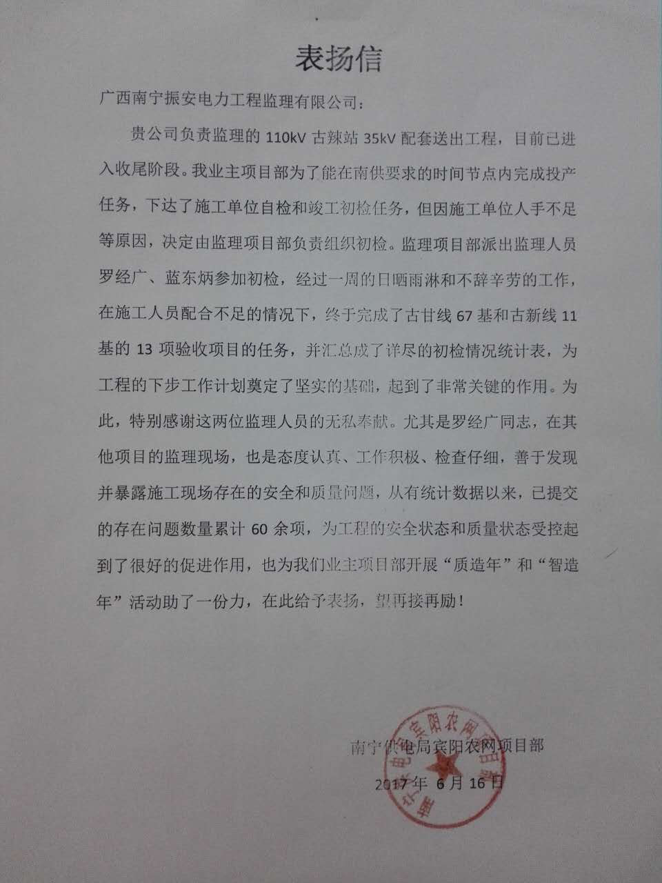 公司宾阳监理项目部及罗经广、蓝东炳等同志于2017年6月16日得到了业主南宁供电局宾阳农网项目部的书面通报表扬(详见附件一)。