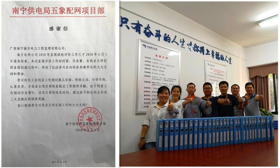 为了配合五象分局业主项目部参评2018年南方电网公司星级班组工作,南宁监理项目部监理人员积极配合业主,做好迎检项目(回建安置3号点1号配变新建及配套低压线路工程)的各项准备工作以及迎接工作得到了南宁供电局五象配网项目部的书面感谢。