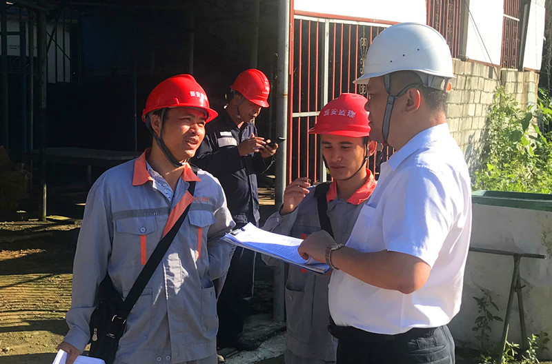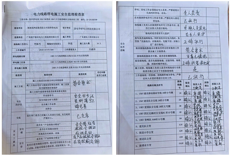 上午7点50分保亭县供电局韦平局长到停电施工现场,检查项目停电施工现场监理工作的开展情况,项目总监黄盛现场汇报介绍振安公司对停电项目的管理要求,即现场监理人员按照公司工程部下发的《电力线路停电施工安全监理检查表、旁站记录表及表C.0.4线路停电施工监理交底记录表》对施工现场进行检查,韦局长看了振安公司监理人员检查表后指出:振安公司现场检查表检查项全面、实用,特别对现场使用的(电力线路停电施工安全监理检查表)、(表C.0.4线路停电施工监理交底记录表)中接地装置位置、时间、装置人员都有记录要求,能更好的对停电现场安全、质量管控,同时对振安公司监理人员到岗到位予、现场管控予以肯定和表扬,振安公司停电现场管控方式值得别的监理单位学习借鉴。