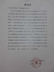 宾阳项目部及罗经广等同志得到业主的通报表彰