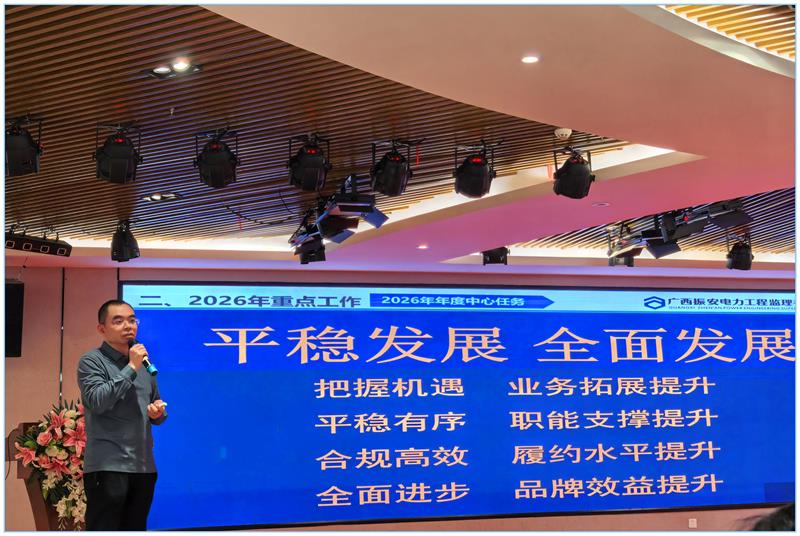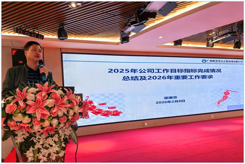 2026年2月8日,公司2025年度工作总结会暨2026年工作布置会在南宁市东方驿酒店召开。总经办领导、各项目部负责人及相关部门代表参加会议。